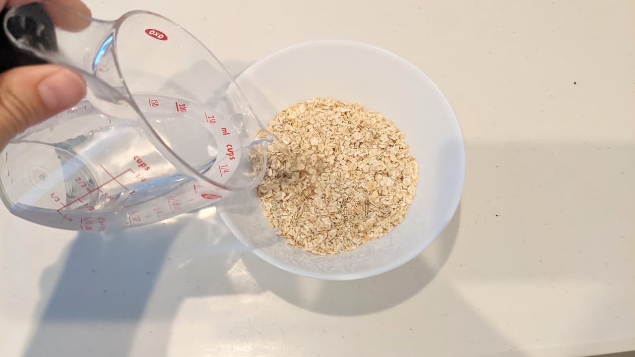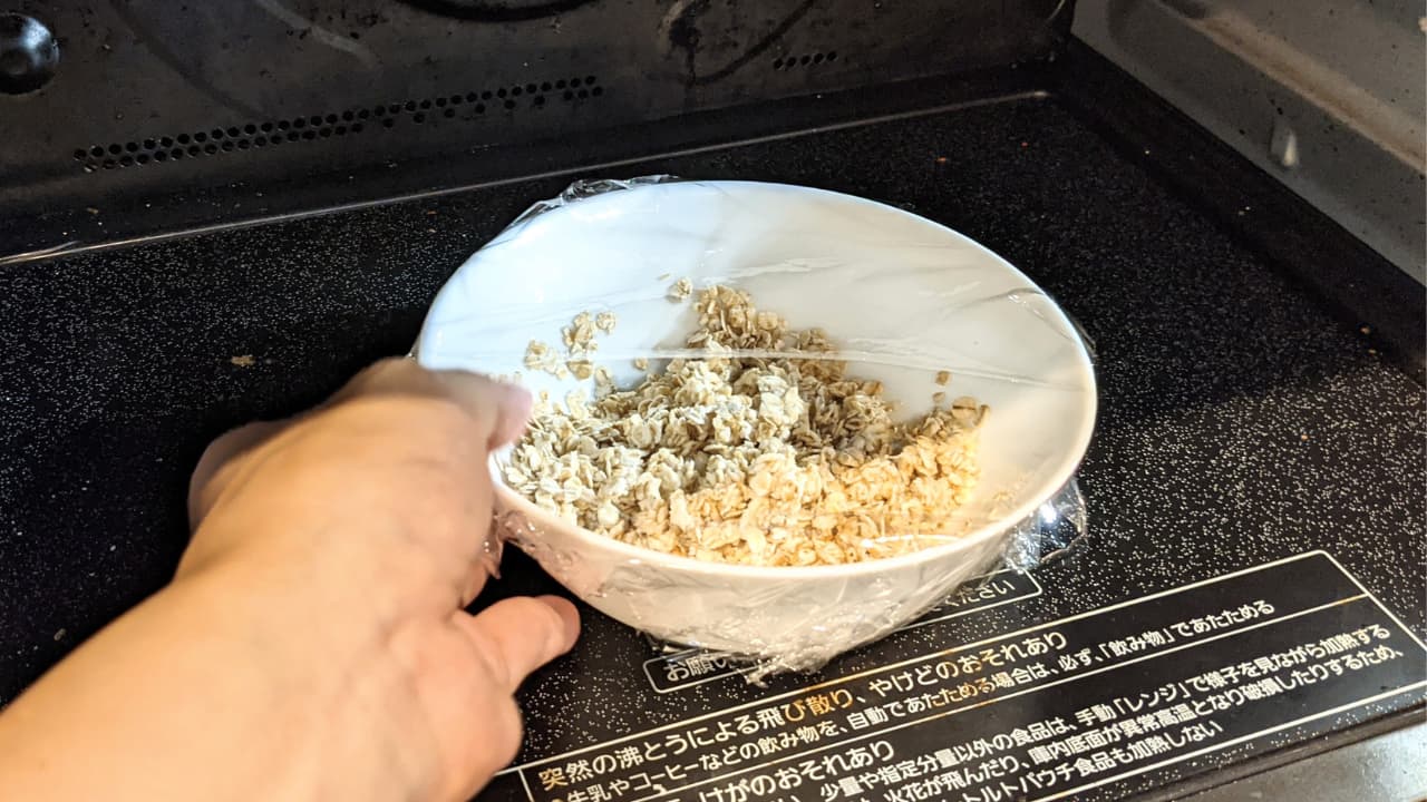 耐熱容器にオートミールと水を入れて600wで1分加熱し、ほぐす。- 3