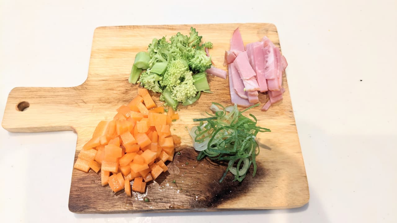 にんじん、ブロッコリーはみじん切りにする。ねぎは小口切りにする。ベーコンは細切りにする。- 2