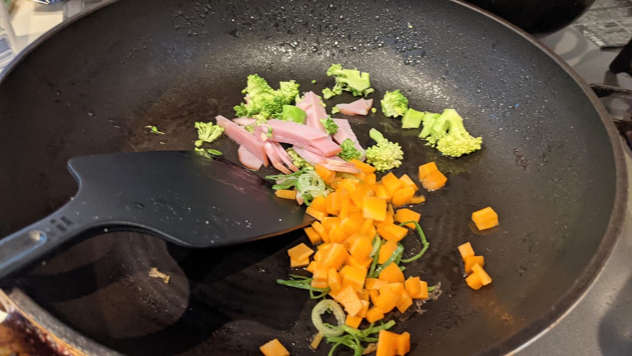 具材をフライパンの片隅に寄せ、空いたスペースに溶き卵を入れ、半熟状になるまで加熱し、具材と炒め合わせる。- 5