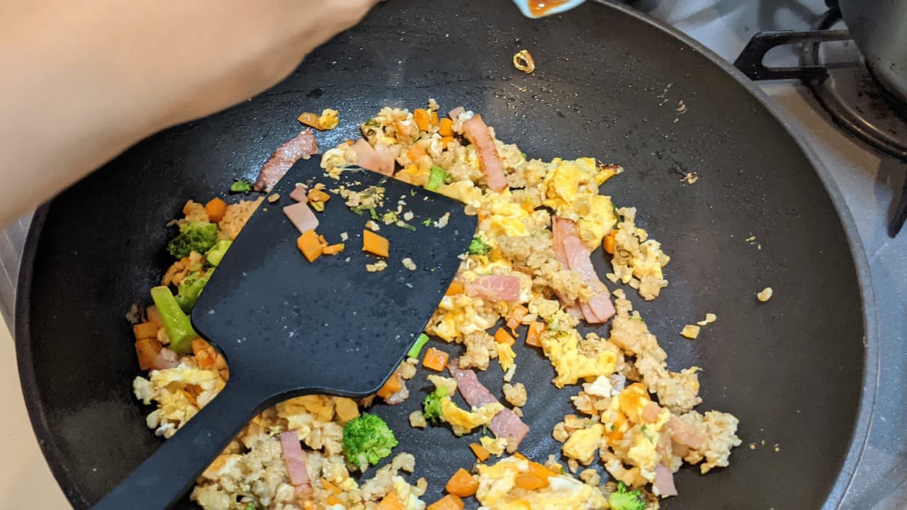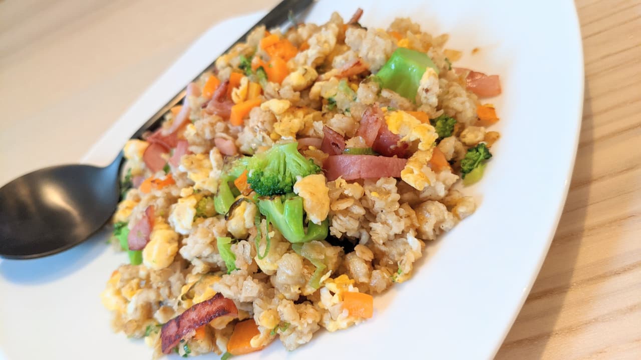 ご飯の代わりにオートミールを使った糖質オフの炒飯のレシピです。いつもの炒飯を作る工程とさほど変わらないので忙しい時にもサッと作ることができます。在宅ワークやお休みの日のおうちランチなどにぴったりです。オートミールは食物繊維が豊富ですが、ブロッコリーやにんじんなどの野菜もたっぷり入れるので、この一皿で食物繊維をたっぷり摂ることができて満足感が得られますよ。オートミールはご飯に比べて一食あたりのカロリーや糖質も低いのでダイエット中の方におすすめのレシピです。この炒飯に置き換えることで糖質量は約半分カットすることができますよ。