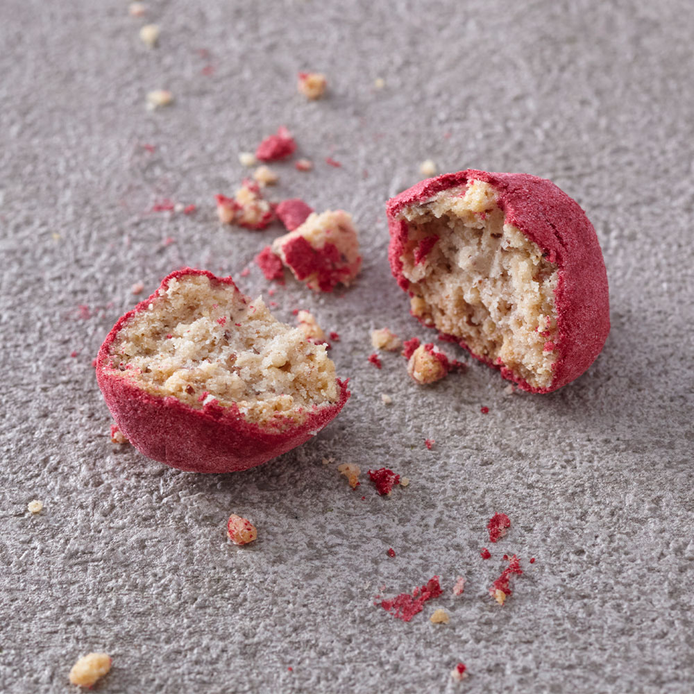 甘酸っぱいラズベリーパウダーに包まれており、名前の通りきれいなルージュカラーの美しい焼き菓子です。