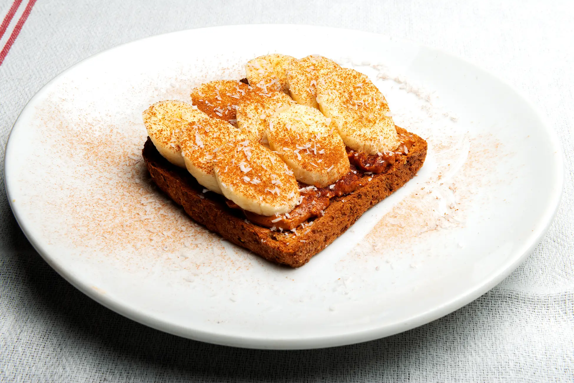 アリサンの人気商品、「有機ピーナッツバタークランチ」と風味豊かなバナナをトッピングしたオープントースト。