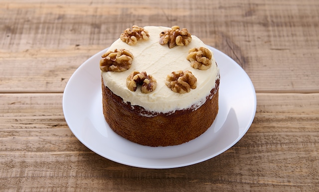 たっぷりの人参のすりおろし、胡桃、レーズン、スパイスが入ったグルテンフリーの生地に、クリームチーズのアイシングが乗っています。
