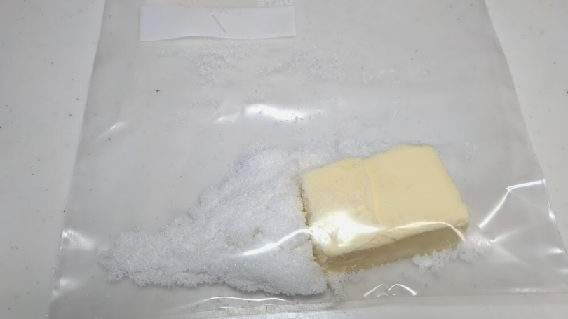 ポリ袋にバター、砂糖を入れて馴染むまでよくもむ。- 3