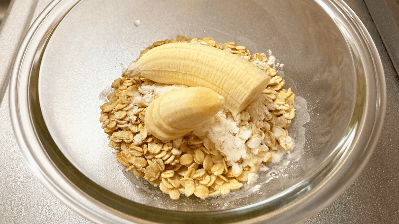 ボウルにオートミール、薄力粉、オリーブオイル、水、塩、カットしていないバナナを入れ、フォークでバナナを切りながら混ぜ合わせる。