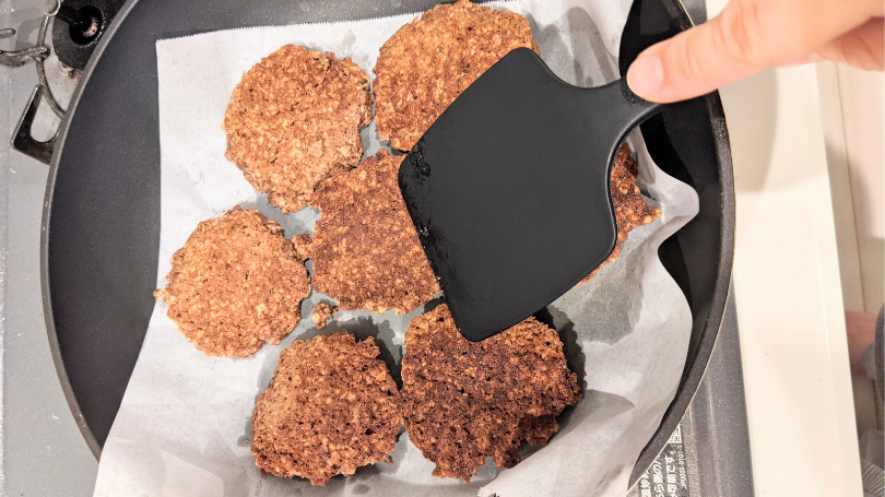 オートミールのクッキーが焼きたいけれど、うちにはオーブンがない、という方におすすめのレシピです。オーブンや型を使わずに、フライパンでお手軽にしっとりとしたココアクッキーができます。フライパンはオーブンに比べて、火力が強くクッキー生地の底が焦げやすいので、様子を見ながら焼きましょう。裏返す前に火を止めて蒸らすことで焦付きを防ぐことができます。