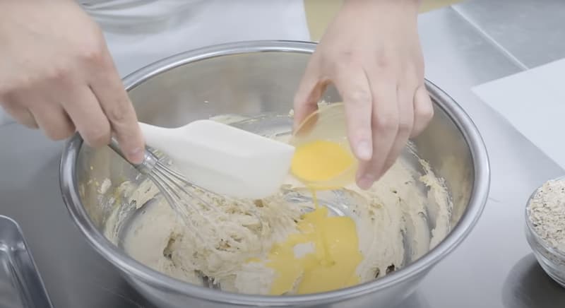 溶きほぐした卵を3回に分けて加え、その都度よく混ぜる。