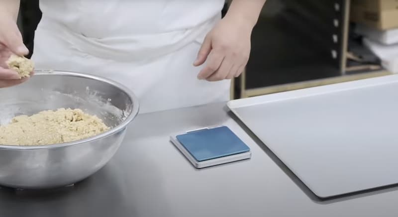 生地を25gずつに分割し、手で丸めて天板に並べて平らにする。