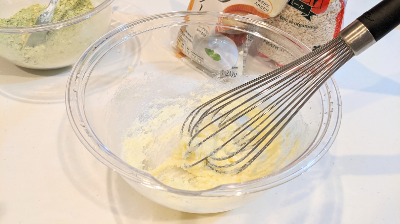 違うボウルにバターと砂糖を入れ、ホイッパーで、白っぽくなるまですり混ぜます。